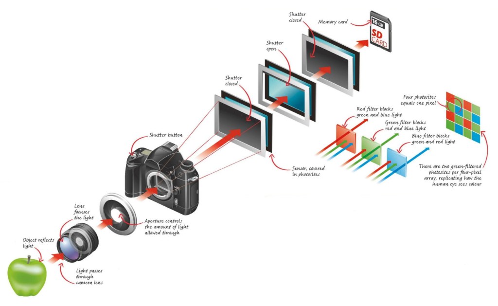 Above is an image illustrating how a camera captures and processes an object’s image, storing the data onto an SD card. First, an object is captured with light reflecting off it. The lens focuses the subject and allows light to pass through the aperture. This light then passes through the shutter, which, when open, allows light to reach the digital sensor. Here, photosites collect the photons.