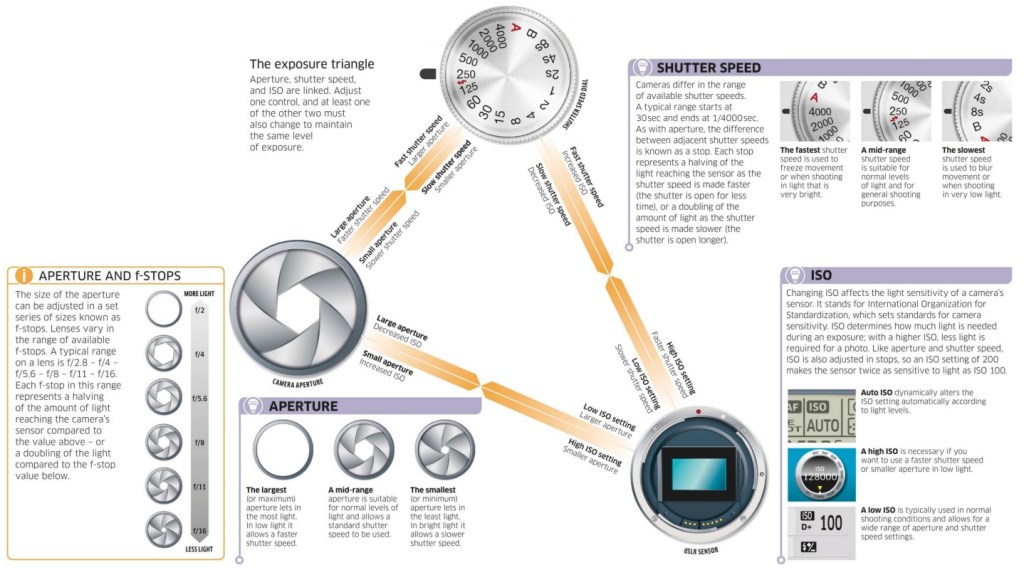 The table below shows some example settings for the exposure triangle that give you some indication of the relationships between Aperture, Shutter Speed and ISO. This is only a guide, use these as a baseline and experiment, the rule is use what works best for you.