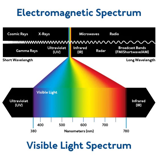 Visible light is only a narrow range of electromagnetic frequencies. If we look at the image above showing the visible light spectrum we can get some idea of how much of the spectrum we can actually see. Modern cameras can detect a wider range of frequencies than the human eye, which is why pictures can be affected by ultraviolet light and X-rays.